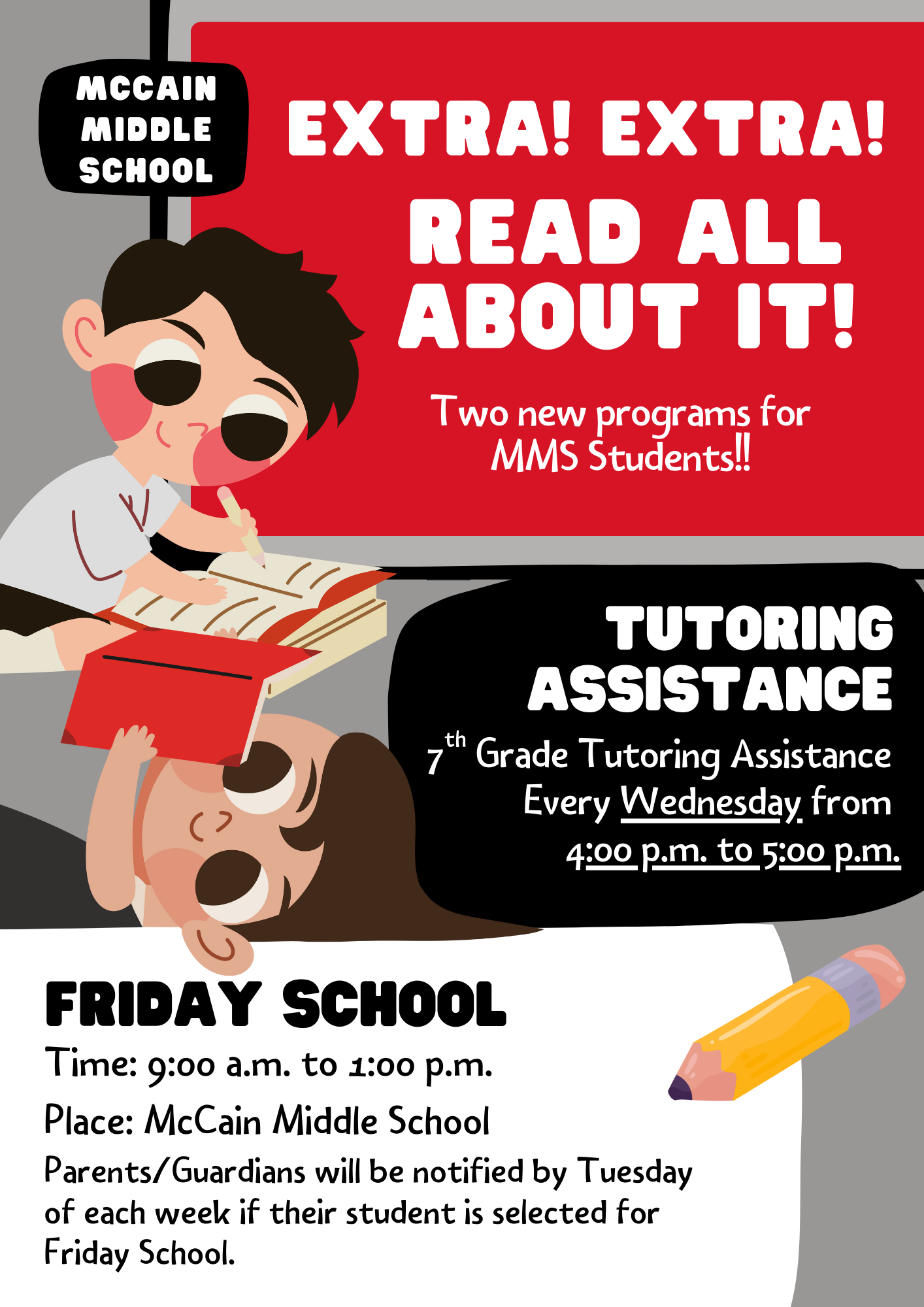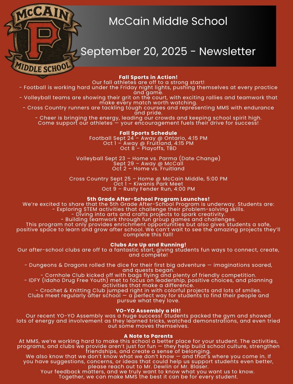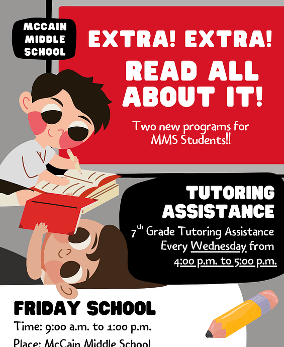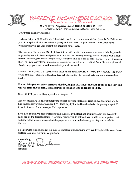 McCain Middle School Proud to be a Pirate! At MMS, we offer a variety of engaging, exciting, and rigorous courses and extracurricular activities designed to support students as they learn and grow together. Please accept our invitation to join us this year at our many activities and events. Your involvement and support of students enhances their educational experience in so many ways.